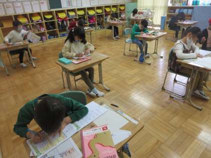 1年教室ではドリルを使って漢字の学習中でした。書き順を確かめたり、お手本をなぞり書きしたりと集中して取り組む姿に成長を感じますね。