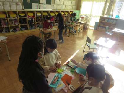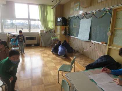 校庭で遊びたいところをがまんして、教室で過ごしていました。1年生は大好きな折り紙で遊んだようです。一方、2・3年生は、教室内を飾りつけして…(つづく)