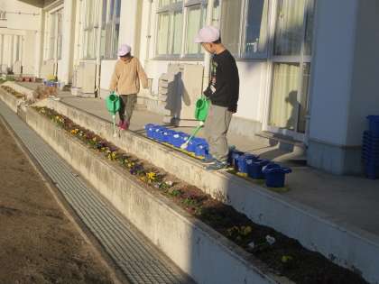 終業日ですが、子どもたちの学校生活リズムは変わりません。まずは、朝のランニング、そしてお花のお世話です。