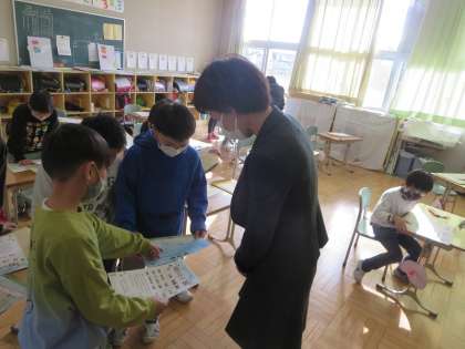 冬休みに持って帰るプリントやおたよりを袋に詰める子どもたち。そこには小泉五リンピックの記録証もありました。自分の記録が伸びたことに気付いて喜んでいると、友達が集まってきて五リンピックの話題で盛り上がるのでした。ほんと、自分の目標をもち、努力をした小泉っ子たちなのです!