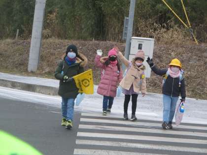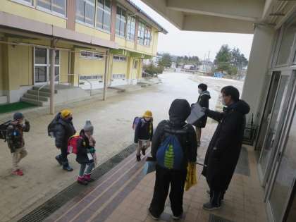 朝7時、氷点下の気温です。雪が静かに、はらはらと落ちてきています。3連休明けですが、小泉っ子はテンポよく集団登校してきました。