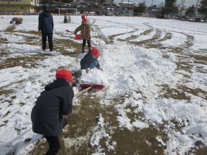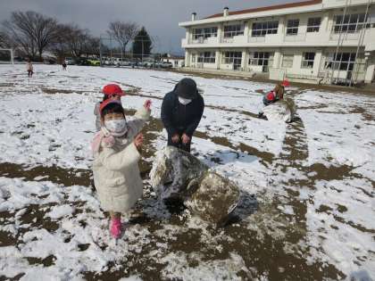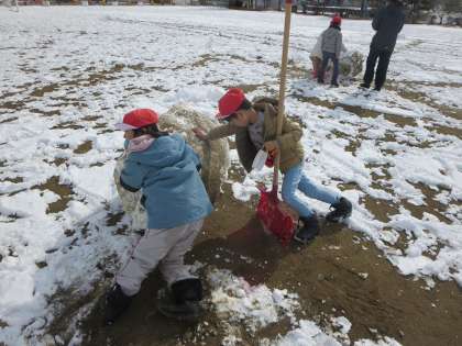 1年生は生活科の学習でも雪とのふれあいを楽しんでいました。土や砂がついて黒くなってしまうものの、雪かき用スコップで雪を集めたり、大きな雪玉をつくったりすることに夢中でしたね。