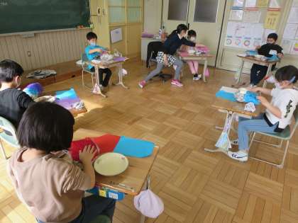 ビニル袋に新聞紙を詰めて丸みをおびた形にした2年生。そのあとは、そこにペタペタとお花紙を貼っていきます。なかなか上手に貼れなくて苦労している姿が見られました。でも瞳は輝いています。きっと作りたいもののイメージが浮かんでいるからなのでしょう。次の活動でこのお花紙がどう変身していくのか楽しみです。