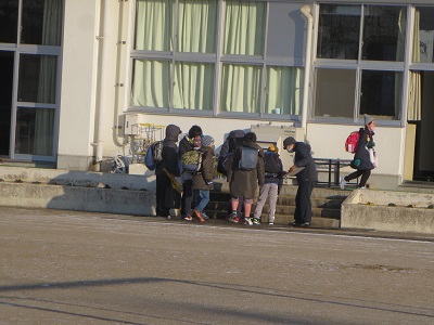 朝方、雪が舞いましたが、小泉っ子の登校時間帯は晴れました。足取りはやや重たげですが、きちんと班登校をしてきたことをうれしく思います。