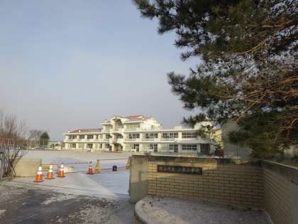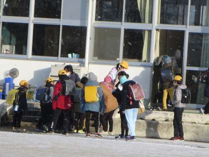 雪が舞う氷点下(−3度)の朝。校庭が白くおおわれていました。