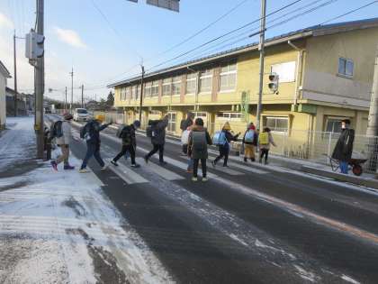 手袋の中の指先が冷たく感じる寒さでも、小泉っ子はしっかりと歩いて登校してきました。気持ちのよいあいさつがあちらこちらから聞こえてきます。