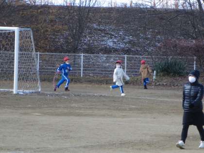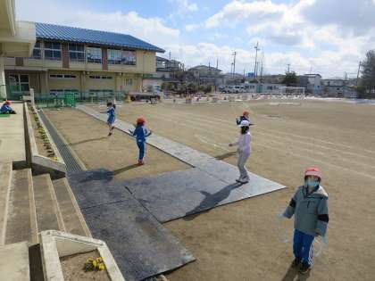 テストのあと、なかなか気温が上がらない寒い校庭へ子どもたちが出てきました。