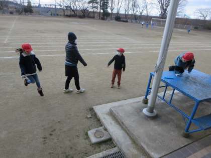 学力テストで使ったエネルギーを取り戻そうと、休み時間遊び回る1年生。なわ跳びに鬼ごっこ、凧あげなど、夢中になっていました。