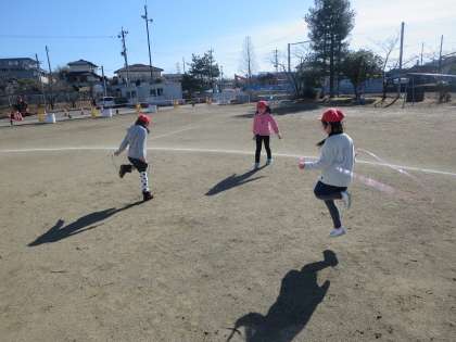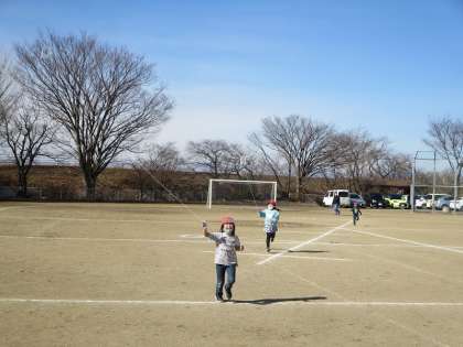 休み時間の校庭。強い日差しを受けて子どもたちは自分のやりたい遊びに夢中です。風があまりないので、凧あげをするのには一苦労です。でも「風がないのなら自分でおこそう!」と思いっきり駆け回る1年生でありました。ぽっかぽかで「春」という感じでした。