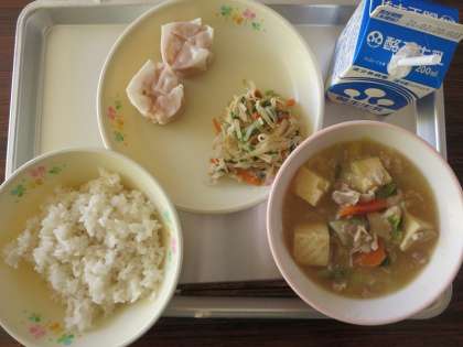 麦ごはん、牛乳、ホイコーロー、カニシューマイ、ニラとえのきのサラダでした。