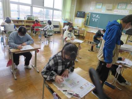6年生は算数しあげのテスト。「今度こそは100点満点!」を目指して、問題をよく読み、慎重に解いています。