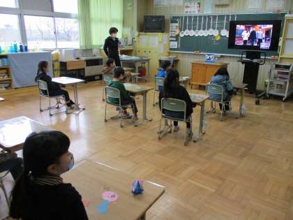 児童会運営委員会の6年生と先生とが準備し、Zoom(ズーム)を使ったオンライン集会を行いました。書き初め展や少年の主張コンクールの賞状伝達のあと校長から次のような話をしました。