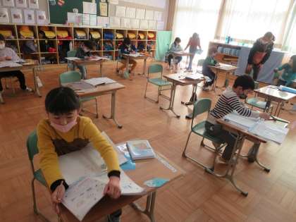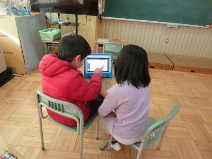 1年算数では、教科書やドリルなどの問題を使って、学習した内容の復習を行っていました。3年の授業では、タブレットドリルにチャレンジしている姿を見かけました。