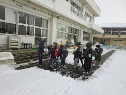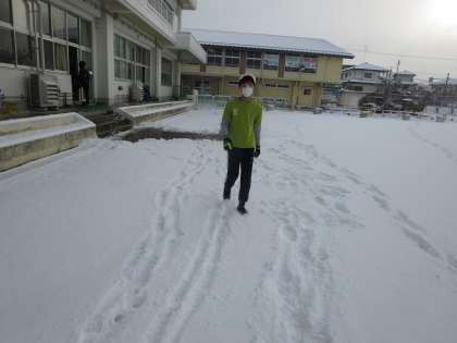 雪の量が多かったので、いつもより時間がかかった子どもたち。でも、全員が無事に登校できてよかったです。今朝は校庭も走りづらいだろうから運動は…、と話していたときに6年生が走る気まんまんで出てきました。そして走り始めたのでした。