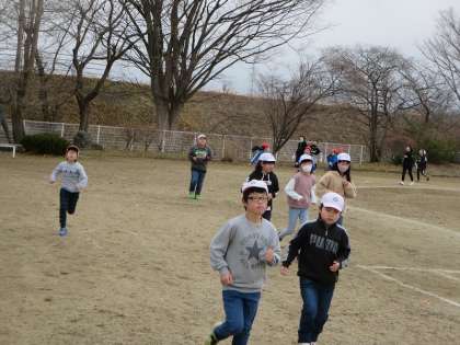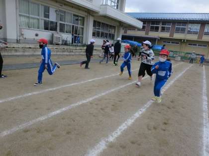 風に負けず、走り隊!子どもたちの朝の運動がスタートしました。走っている途中でポツン…ポツン…と雨が落ちてきましたが、50m走にチャレンジする子どもたちを待っていてくれたようで、最後の走者がゴールしたときにサーッという降り方になりました。