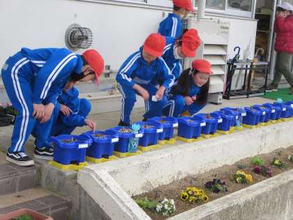 雨が降っているのですが、自分の鉢にはあたっていないからと水あげをする1年生の姿が愛らしいです。