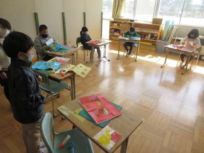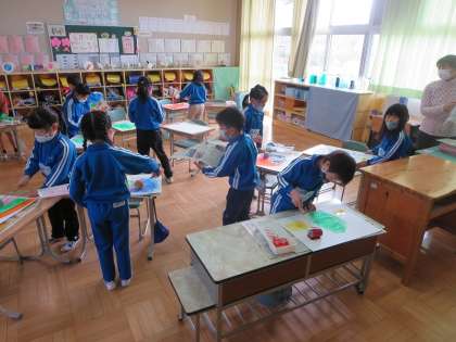 1・2年生はそれぞれ図画工作の授業を行っていました。ローラーで塗ったあとにできる模様から想像を広げたり、カッターで切り取った窓の中に自分の気に入ったものを描き加えたりと、目を輝かせながら学習していましたね。