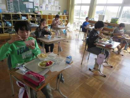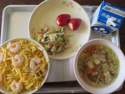 ちらしずし、牛乳、しめじのすまし汁、笹かまと野菜のごまみそあえ、いちごの、桃の節句献立でした。