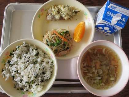 わかめご飯、牛乳、たらのみそマヨネーズ焼き、焼き豚入り香味あえ、いもがらのみそ汁、せとかみかんでした。