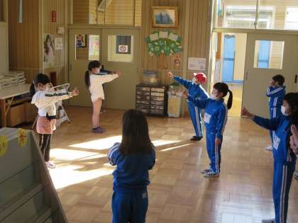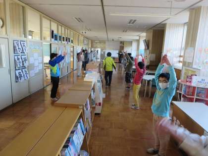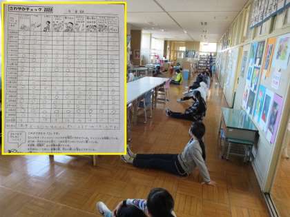 からだと生活の状態をチェックするさわやかタイム。ラジオ体操とアイアイ体操でのばしたりほぐしたりする小泉っ子。上学年はそのあとに体幹運動で「ヒーヒー」していました。