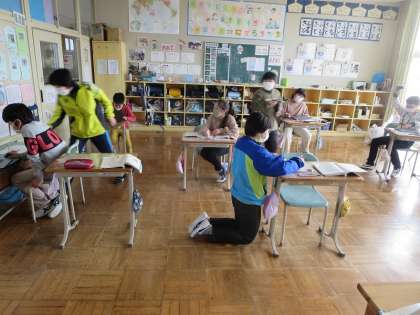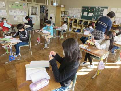 自分だけの詩集づくりに入った4年生。用紙を折ったり重ねたりする作業が実にていねいでした。作品を選び、ていねいな字で視写できますように…。