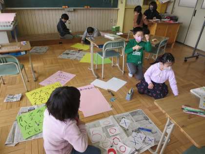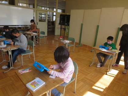 九九や鉄棒、なわ跳びなど、できるようになったことがぐーんと増えた2年生。国語で学習した内容を3年生にも伝えたくて、クイズ形式で発表することにしたようです。先生や友達と一緒に準備したり練習したりする姿がすばらしいですね。2年生もタブレットドリルにチャレンジしています。使い方になれていきましょう。