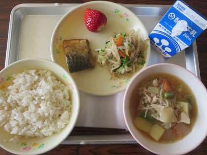 麦ごはん、牛乳、肉じゃが、さばのみそ煮、茎立ち菜のおかかあえ、いちご(あまえんぼう)でした。