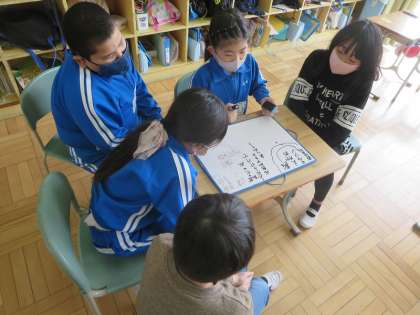 2・3年生が一緒になって考え中です。6年生を送る会のとき、6年生のすてきなところを五七五で紹介した2・3年生。同じようにある人のすてきなところを五七五で表現しようと意見を出し合っていたようです。ぴったりとくることばを見つけようと、うーんと悩んでいる表情から学習に向かう強い気持ちがうかがえました。