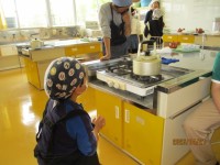 今回は包丁を使用。包丁の使い方、食材を押さえる手の形など、班で教え合う姿がありました。どの班も前回の実習を生かし、準備や調理など分担しながら、手際よく調理をしていました。
