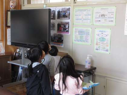 3つの班に分かれて、2年生がリーダーとなり、学校にある教室や体育館などに1年生を案内していました。教室の入ると、どんなものがあるかなどの説明をしていました。