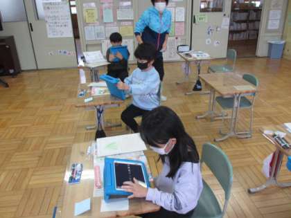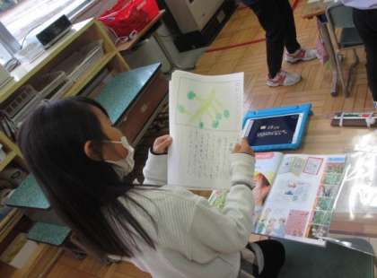 2年生は、生活科で育てた野菜についてパンフレットや新聞にまとめる学習でした。