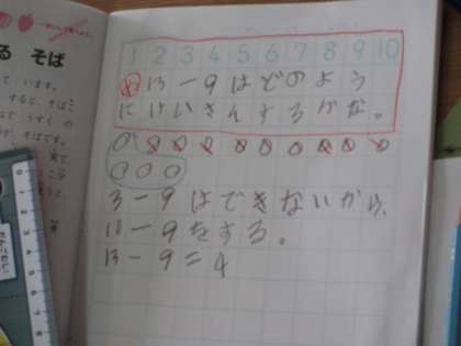 「13を10と3に分け、10から9を引き、その答えに3をたす」という繰り下がりのある計算の仕方をしっかり理解していました。