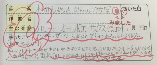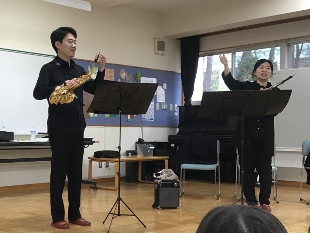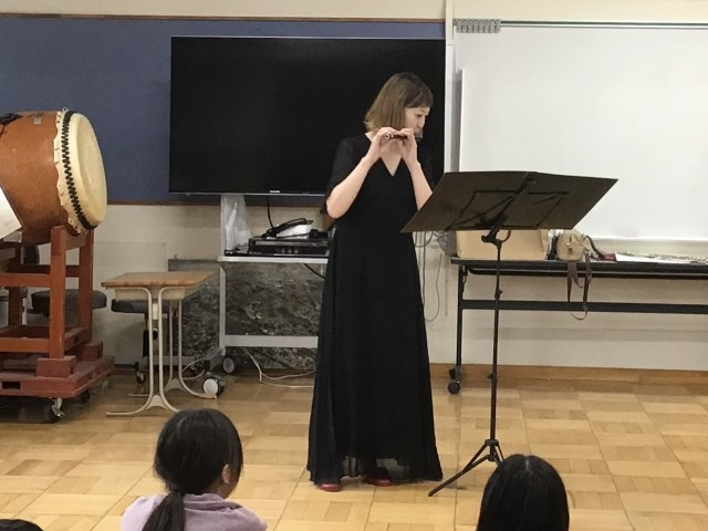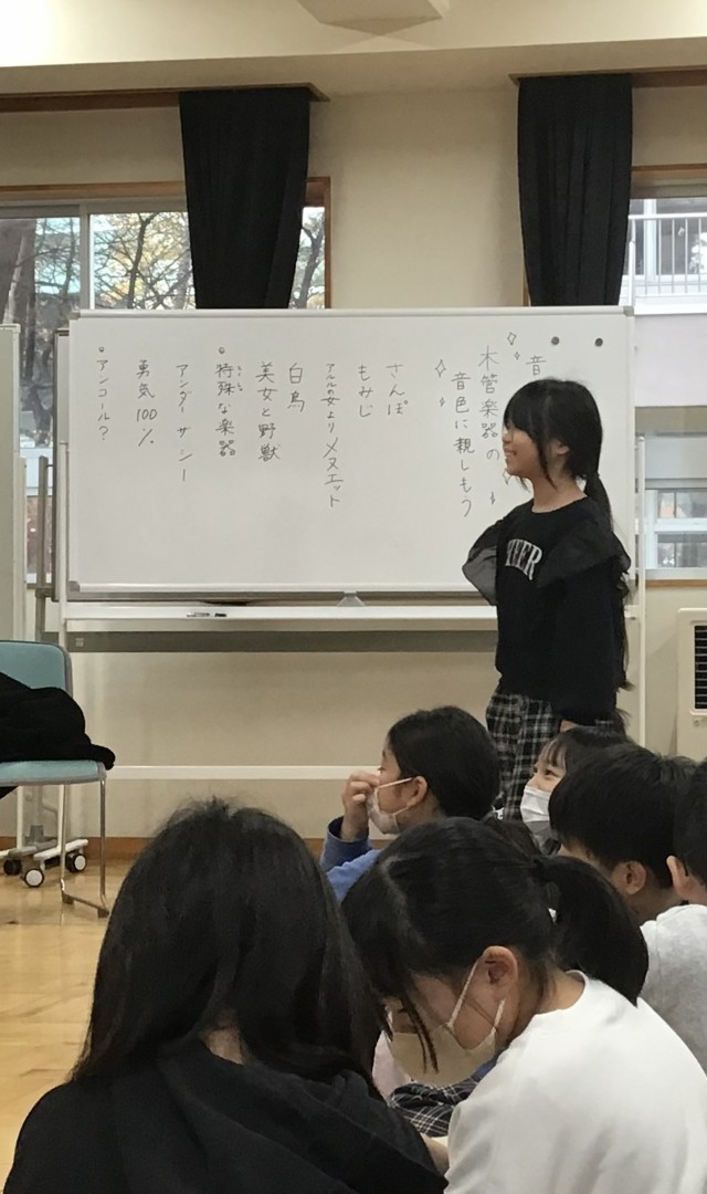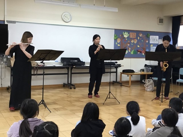 今日の2時間目は4年生の木管楽器鑑賞教室がありました。フルート、オーボエ、サックスを使って、たくさんの曲を演奏してくださいました。もみじ、さんぽ、夢をかなえてドラえもんなど、子どもたちが知っている曲も多く、手拍子をしたり、口ずさんだりしながら、楽しんで演奏を聴く姿が見られました。また、それぞれの楽器の吹き方や音色の違いにも興味をもち、あっという間の楽しい1時間となりました。アンコールにもこたえていただき、ありがとうございました!