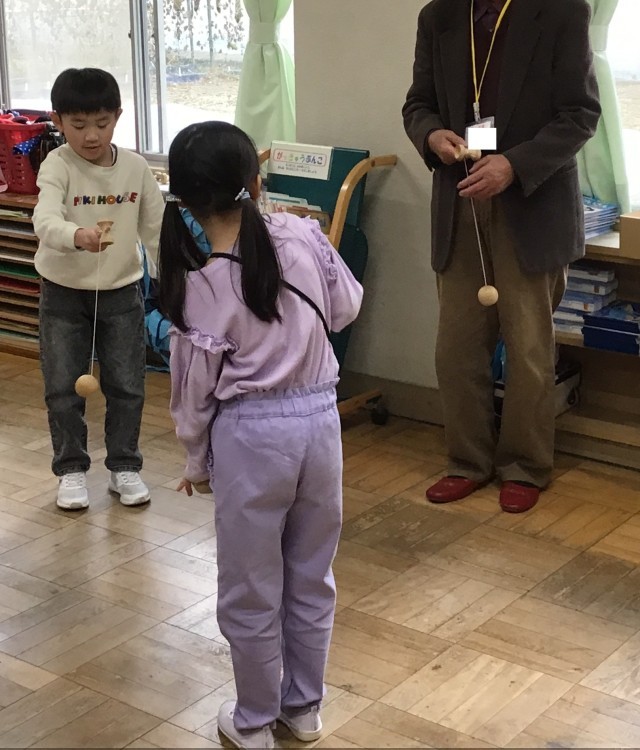 12月10日(水)の3・4時間目は、「むかしあそびの会」という生活科の学習がありました。地域の方に来ていただき、けん玉やめんこやこままわしなど、たくさんの昔遊びを習うことができました。6種類くらいあったので、みんな夢中で遊んでいました。楽しい会となりました。