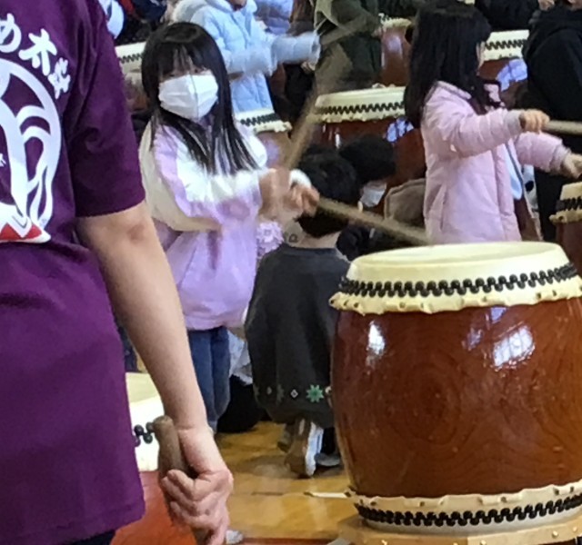 そして同じ日の5時間目には、鑑賞教室の中で「うねめ太鼓」の演奏を聞いたり、太鼓をたたく体験をさせてもらったりと、こちらもとても楽しい時間となりました。おもいっきりたたく太鼓の音が、体育館に響き渡りました。
