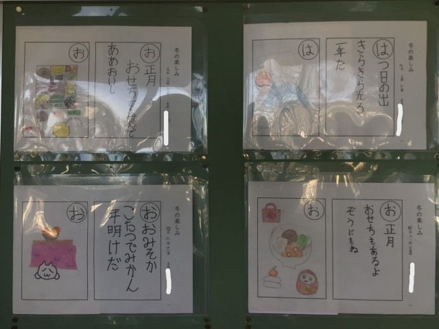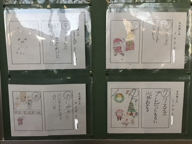 国語の「冬の楽しみ」の学習で、冬の行事をもとにしたかるた作りをしました。クリスマスやお正月、節分などをテーマに言葉や絵を工夫して表現していました。冬は子どもたちにとって、楽しみな行事が盛りだくさんですね!