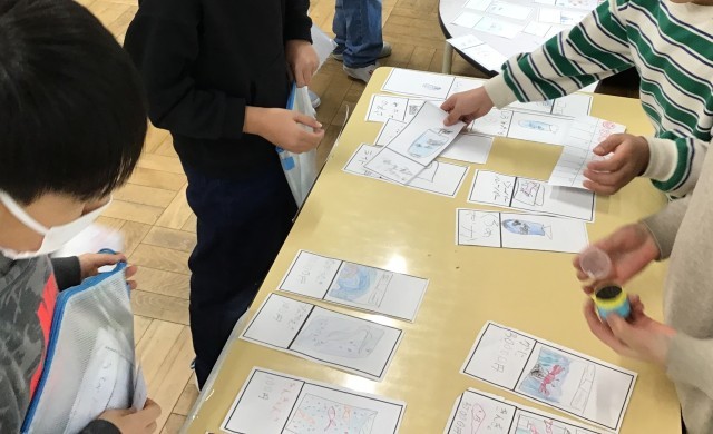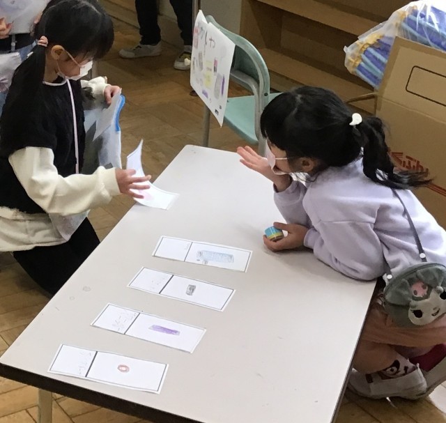 国語の「ものの名まえ」の学習で、自分たちの好きな「お店屋さん」を開店しました。かわいい絵(商品)を描いて、お客さん役のお友達にあげたり、ポイントカードも作って、ハンコを押してあげたりと楽しく活動していました。