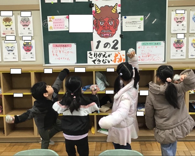 もう一つは、自分たちのクラスで、もう少し高めたいことやこれからのめあてを話し合いました。そして、その反対にあたる「鬼さん」を退治することで、自分たちの意識を高める「節分集会」を行いました。少々風邪が流行ってきたので、Zoomでの集会でしたが、楽しく活動できました。