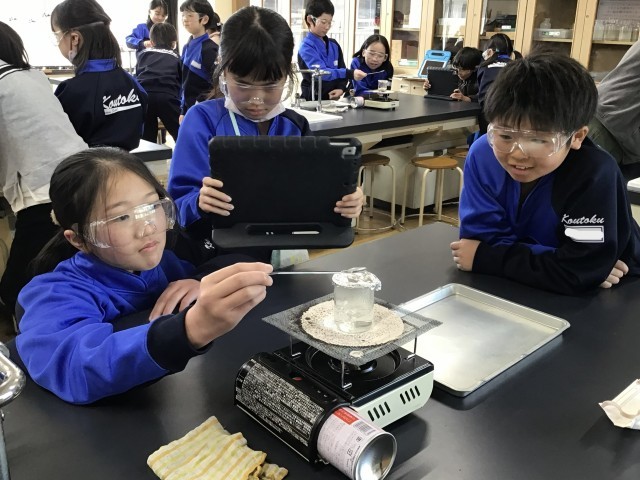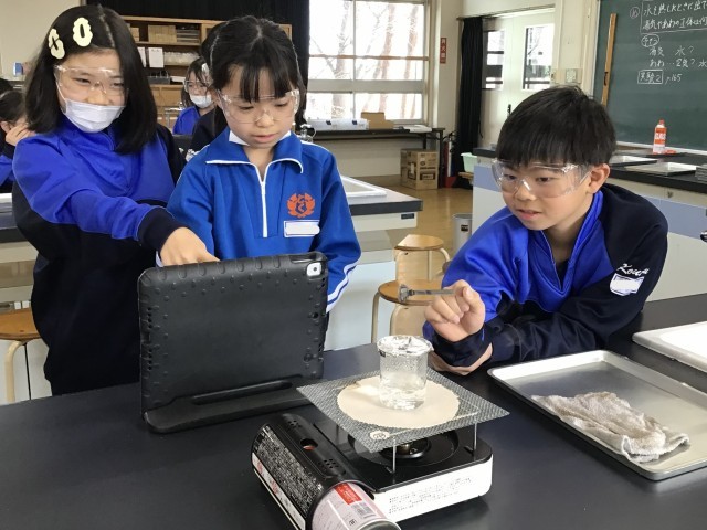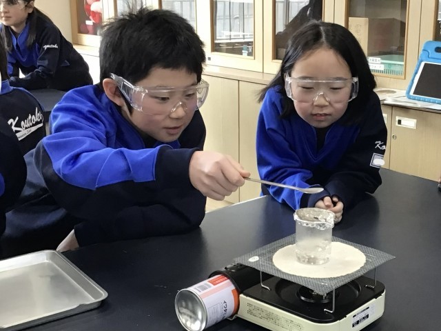 理科の学習で、「水を熱したときに出てくる湯気やあわの正体はなんだろう?」というめあてをもって実験を行いました。今日は湯気の正体を確かめる実験です。保護めがねもしっかり身に付け、安全に実験を行いました。