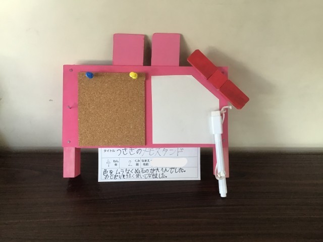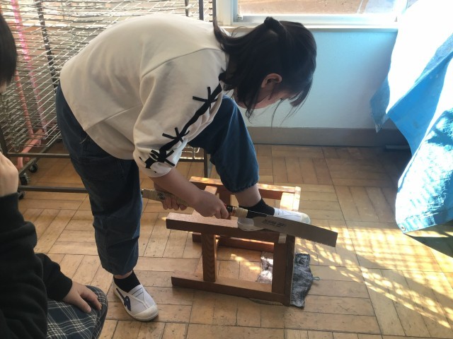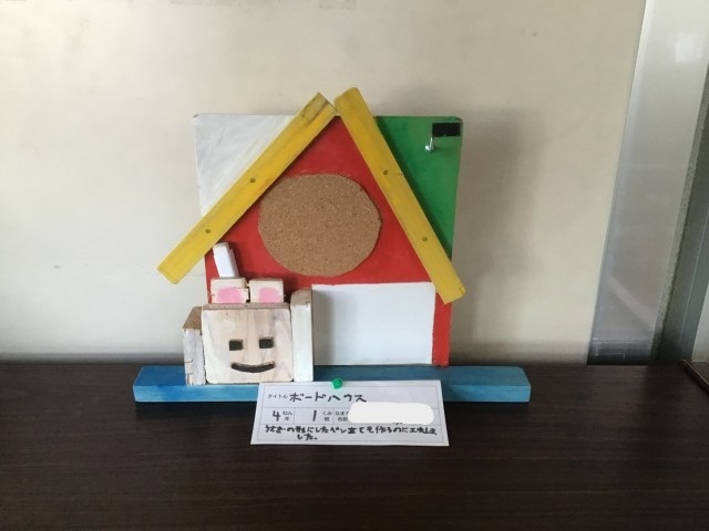 のこぎりで切って、色をぬって、きりで穴をあけて・・・メッセージボードや鍵かけなど、お家でも使える作品を作りました。4年生で初めて使ったのこぎり。けがなく安全に使うことができました。