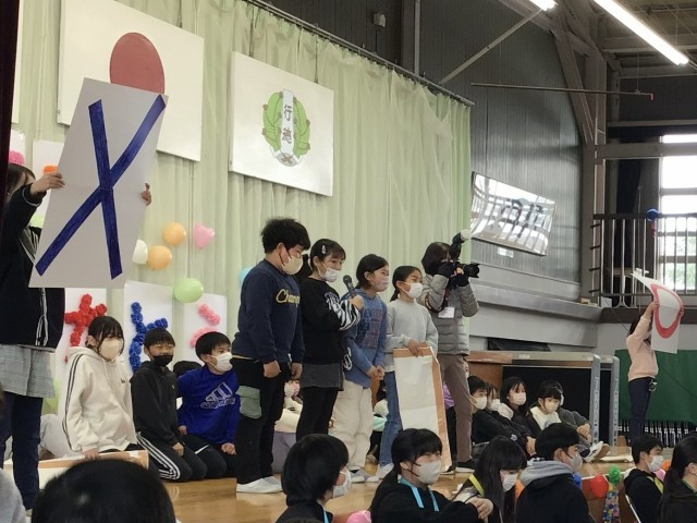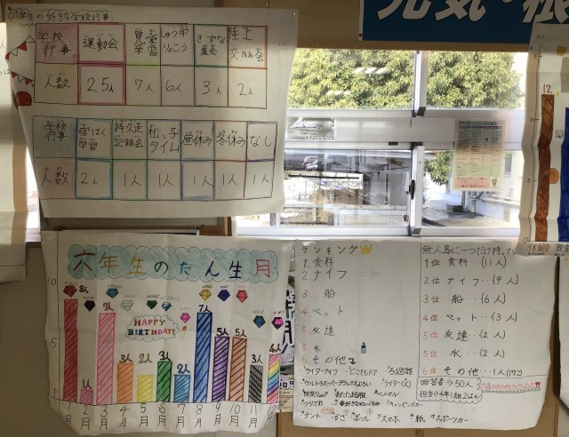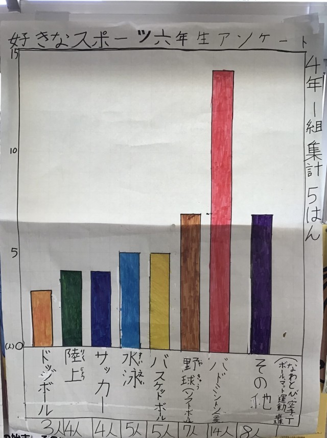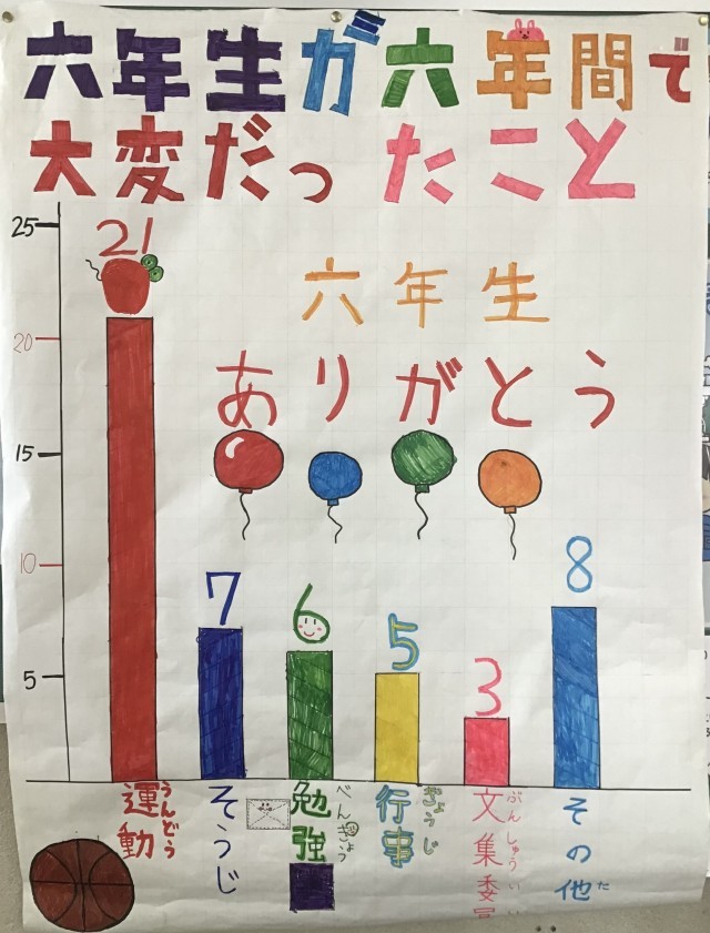4年生は国語で、「調べて話そう、生活調査隊」の学習に取り組みました。6年生にアンケートを取り、その結果を棒グラフや表にまとめました。その結果をもとに、6年生を送る会で〇×クイズを行い、全校生のみんなに楽しんでもらうことができました。
