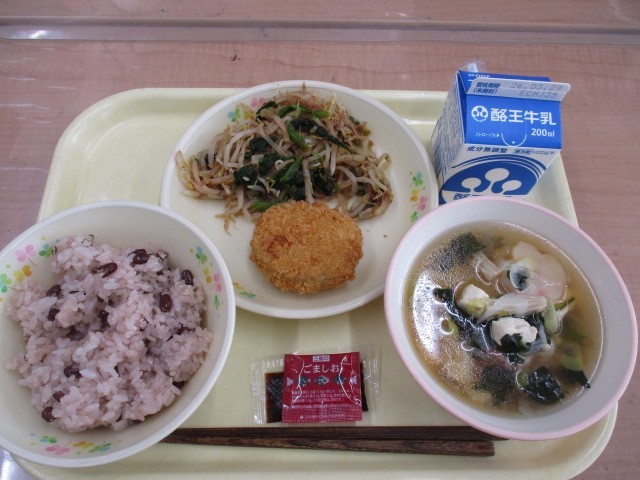 赤飯、牛乳、メンチカツ、茎立菜のおかか和え、お祝い汁、モチクリームアイスでした。