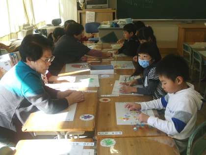 地域の方々に、昔の遊びを教わっているときの様子です。