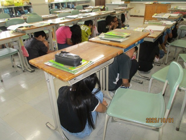 2校時目の授業終了直後10:06..「予告なしシェイクアウト訓練」を実施しました。各学級各教室では,緊急放送の指示を聞いて,机の下で命を守る体制が徹底されました。担任の先生が,出張のクラスも分科授業後に“いつもと変わらず,真剣に”取り組むことができていました。