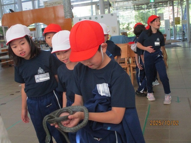 最後におまけの特別タイムがありました。超めずらしいカブトムシやクワガタ,また,ヘビにも触らせてもらえる時間です。ドキドキしながら..ヘビの前に長~い行列ができました。校外に出て直接体験をとおした活動から学ぶこと(五感を使って..心にも)は,今の時代の子ども達だからこそ,とても大切な学びの場となります。1日を通して,バスの乗り降り,ムシテックの到着,ミッションごとに,退所において,帰校時のバスの運転手さんに..「とにかく,2年生のあいさつは◎でした」
