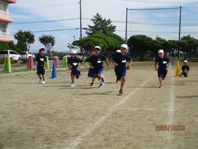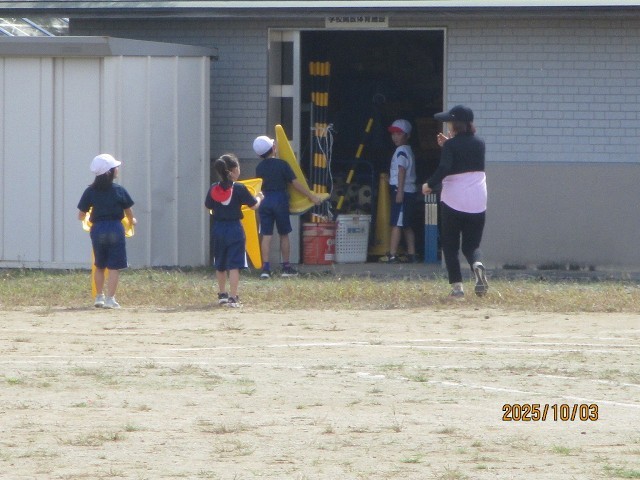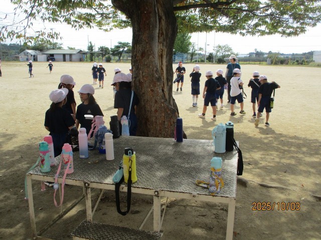 11月の持久走記録会に向けての体育科がんばりが始まっています。今日は,清々しい青空のもとで,1年生が校庭3週(600m)を走りました。コーナーに置いたカラーコーンの片付けも1年生が自分たちでするのです!(立派です)