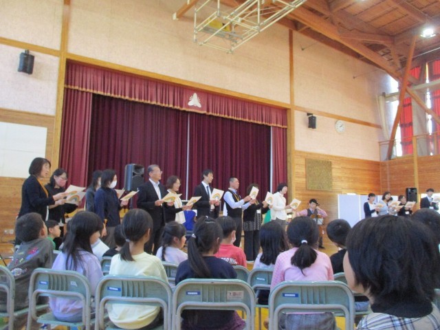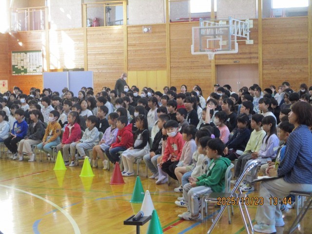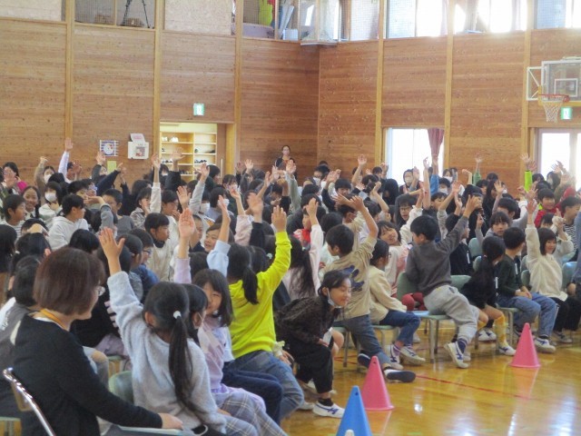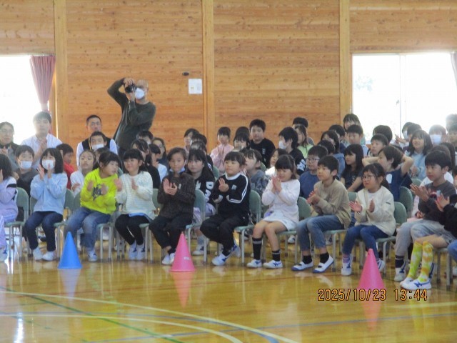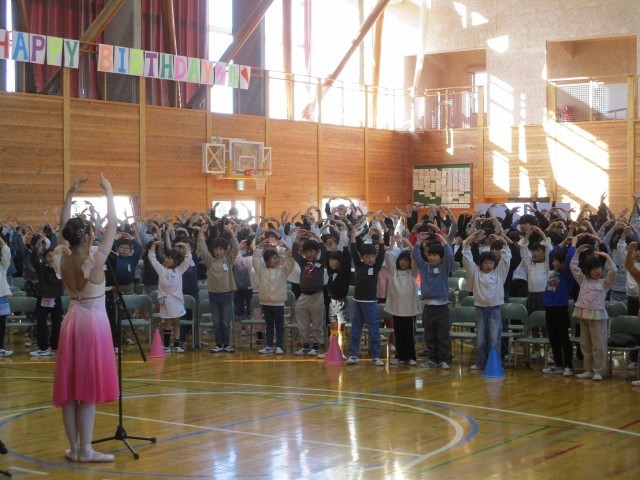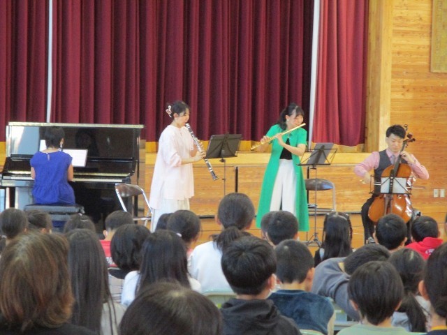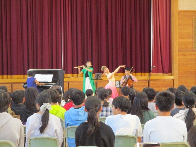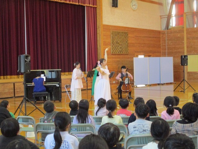今日は,がんばってきた子ども達に,プレゼントの演奏会です。心地よく本物の楽器の音にふれて,150周年記念誌に表した「僕の私のゆめ」を更に大きくふくらませてほしいと願いました。演奏会は,郡山交響楽団の4名の皆さんに楽器の紹介,ルパン三世,みんなで安積二小校歌,そして,サプライズで先生方から「♪にじ」(3番は全校のみんなも一緒に)そしてそして,バレリーナの登場!(バレエ体験も)ベートーベンメドレー等々,子ども達の笑顔とノリノリの参加型演奏会となりました。心地よく音楽に体を揺らしながら聴き入る子も..,音楽っていいな,楽器演奏の魅力にもふれることができました。最後は,「ブラボー!!」大拍手でお礼の気持ちを伝えました。