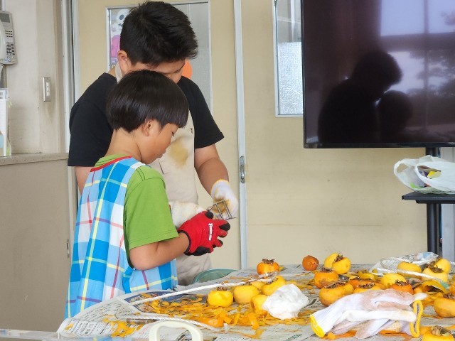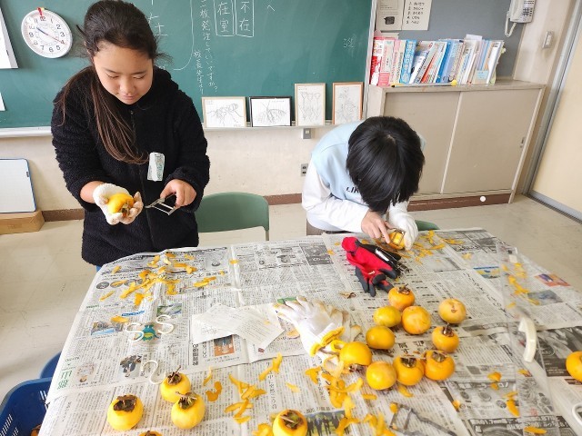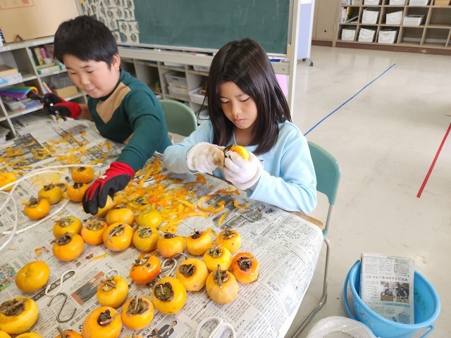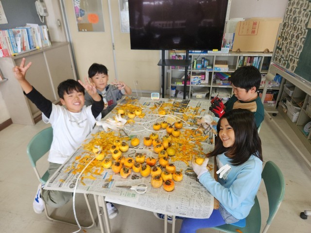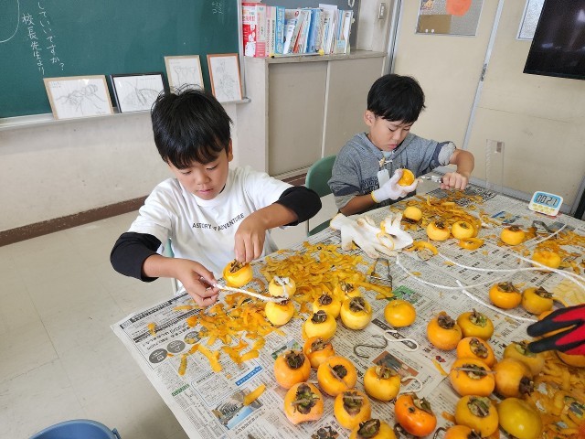 今週土曜日は,創立150周年記念式典です。ステップルームには,大きな大きな「カラフルバースデーケーキ」がほぼ完成!(式典当日まで掲載厳禁です~お楽しみに)また,教室は..干し柿工房に!!140周年の時に記念植樹した柿の木が,今年,たくさんの実をつけました。先生と用務員さんと収穫して,ピーラーで丁寧に皮むきして,干し柿に。。とても楽しそうです。そして,しぼしぼになる前から..おいしそうです。