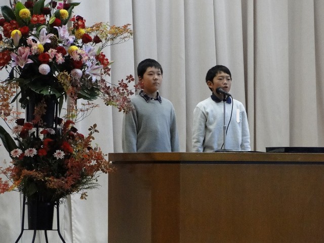 【記念式典第1部】では,実行委員長様のご挨拶,校長式辞,感謝状の贈呈,ご来賓を代表して全校長先生からご挨拶をいただきました。「創立150周年をむかえて」の児童代表のことばは,6年生代表児童によるすばらしい挨拶,また,6年代表児童によるすばらしいピアノ伴奏で校歌斉唱にて,第1部を閉じました。