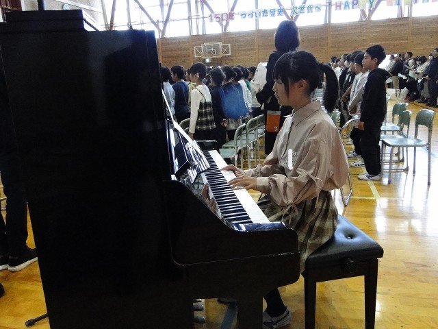 創立150周年記念式典を体育館で行いました。本校教育を..子ども達を励まし応援してくださる地域の方々,歴代のPTA会長様方,歴代校長先生方々と全校児童,保護者の皆様が体育館に一堂に会しての記念式典です。